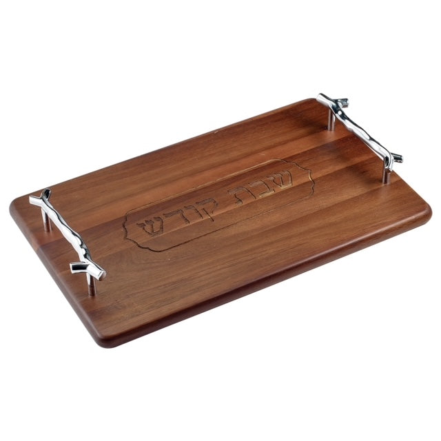 The luxurious effect of acacia wood, complimented by the raised silver-color metal handles and the Hebrew inscription "Shabbat shalom", make this a unique piece.