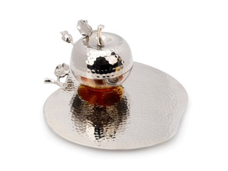 This set comes with a honey jar, spoon, and tray. Made of hammered stainless steel and glass.