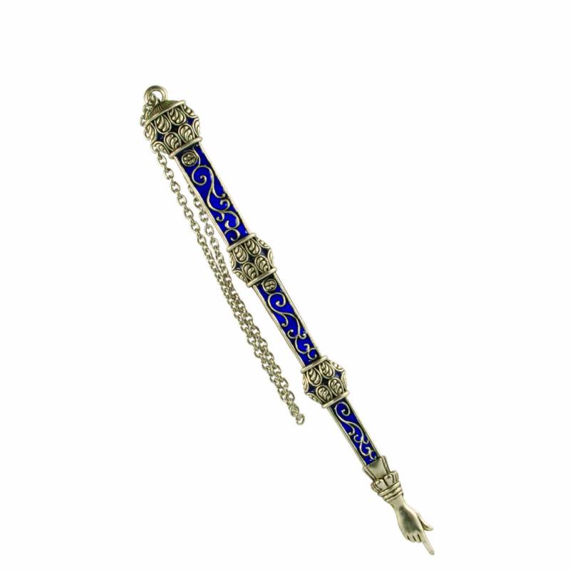 This stunning yad pointer is is handcrafted from pewter and hand-painted in a dark blue, rich enamel paint. It is decorated with silver plated swirl patterns, which lends this piece an arabesque feel. A link chain for hanging is attached and a silver hand points at the bottom to make it easy to follow along when the Torah is read.