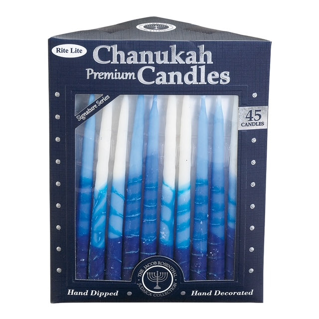 Enhance your Hanukkah menorah with some festive candles! Each candle is hand dipped in a blend of blue colors and decorated by skilled artisans.