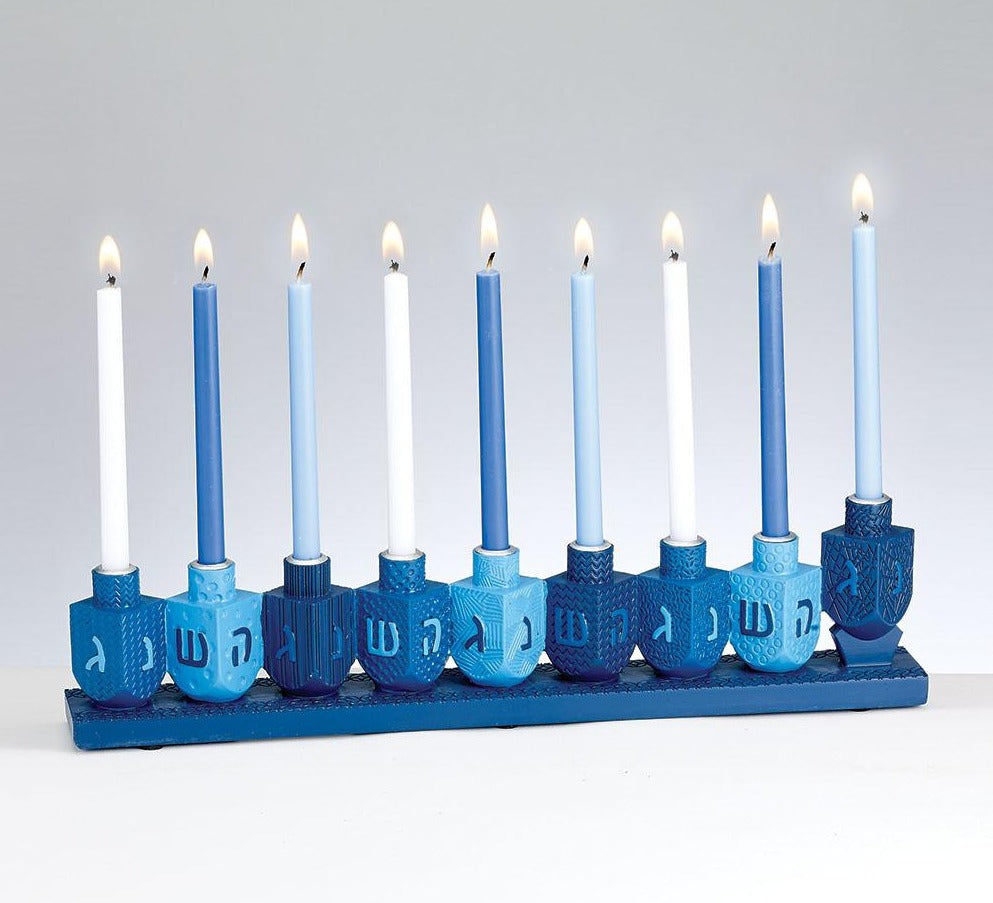 Going with a sweet and classy design is always a sure win! This menorah has eight dreidel candle bases in varying shades of blue, and a ninth elevated for the shamash.