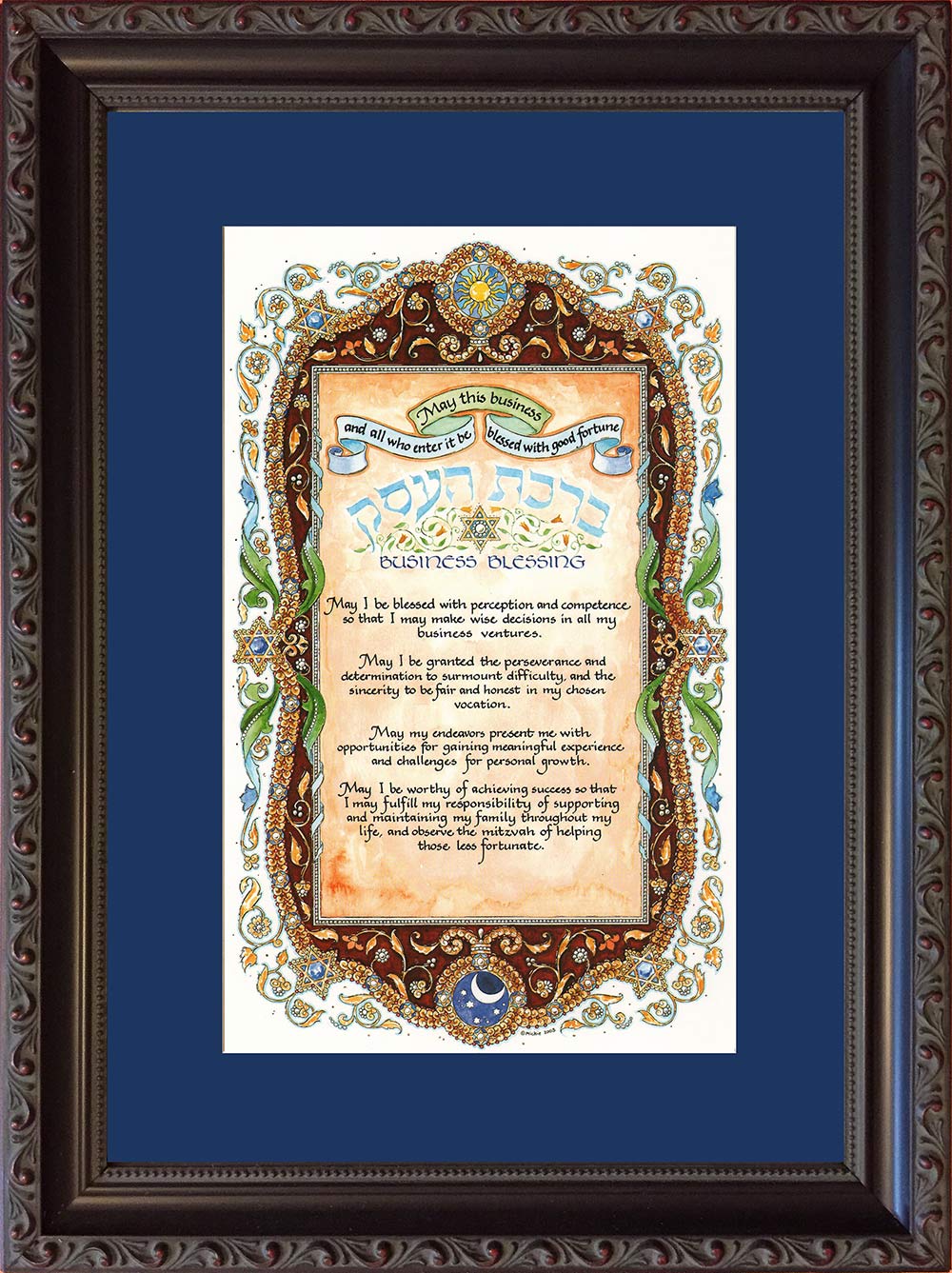 This classy artwork features the blessing for a successful business in Hebrew and English printed on a parchment design. The blessing is surrounded by elaborate elements such as petals, flowers and Stars of David which enhance the old-time look of the piece.
