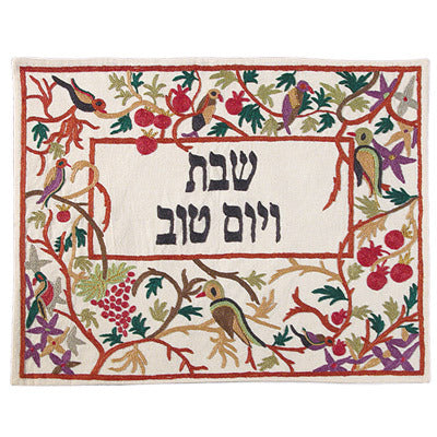 Decorate your Shabbat table with this gorgeous challah cover. It is designed with hand-embroidered colorful birds and the words "Shabbat and Holidays" in Hebrew.