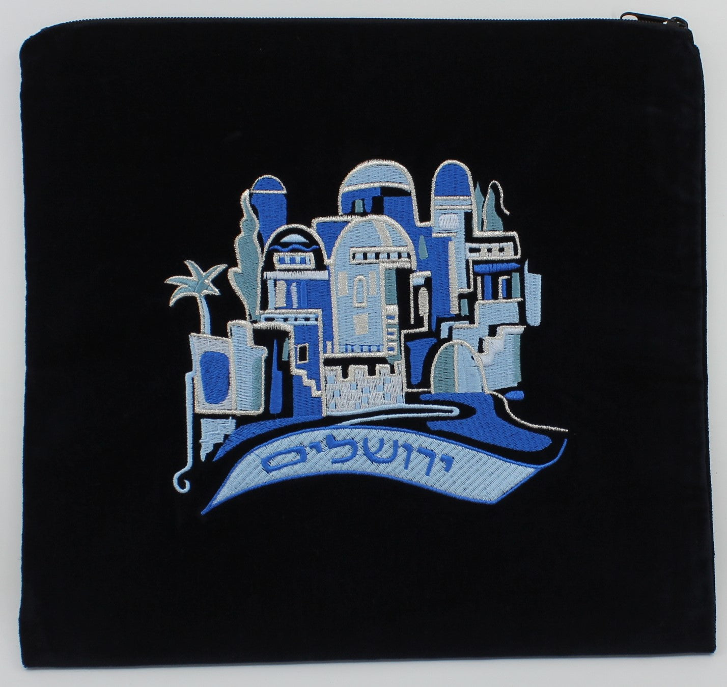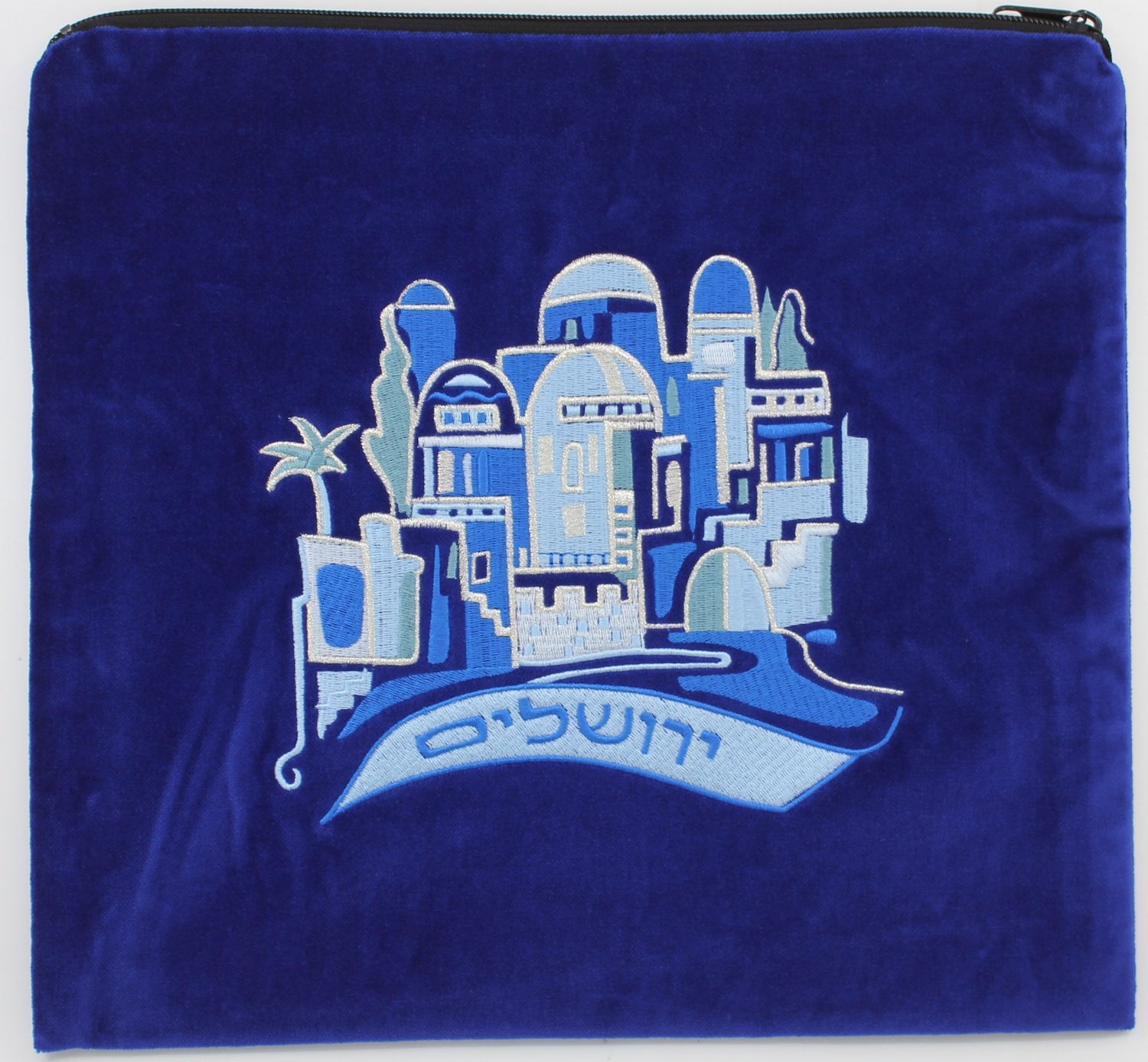 A classic velvet bag with a blue and white embroidery design of Jerusalem, with the word Jerusalem features on a banner on the bottom of the image.