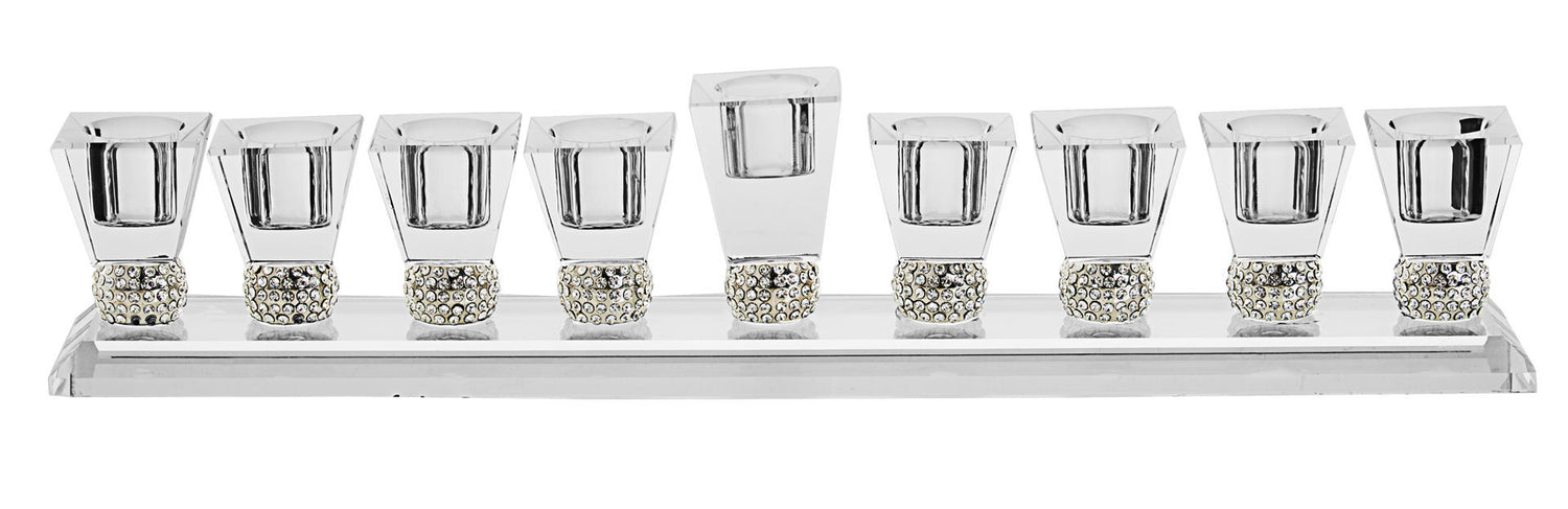 A menorah with loads of elegance that manages somehow to be understated and stunning at once. It's made out of quality crystal and tiny stones that hug the rim of each candle-holder.