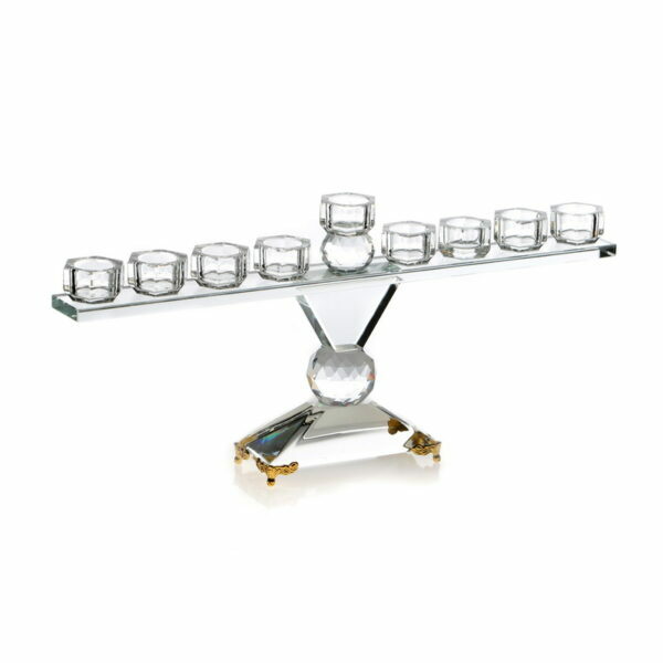 The ornate golden feet at the base of this classy crystal menorah give it a cool edge that sets it apart from other crystal menorahs. This menorah is sure to beautify your space year round.