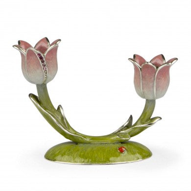 The charming and unique design of this flowery shabbat candle holder makes it stand out among the rest. The stems and base are hand painted a vivid green, the petals a lovely blush pink detailed with glittering pink crystals. Climbing up the base you can find a cute red ladybug. This youthful, playful design makes it an excellent for a bat mitzvah gift, and its compact size makes it great for travel too!