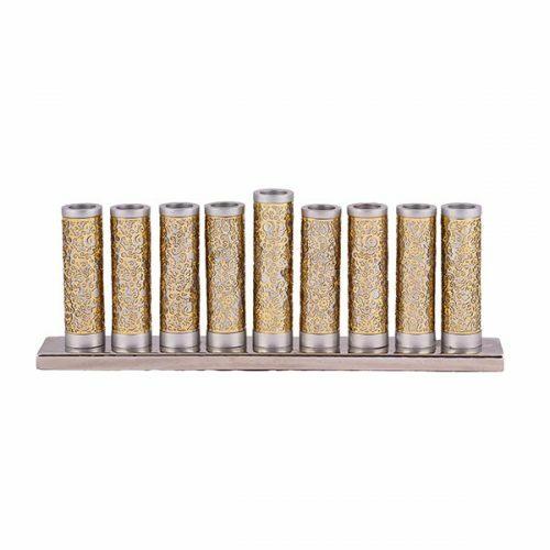 Yair Emanuel does it again with this pretty and unique menorah. It features brass and silver long cylinder candleholders set across an aluminum base. Each cylinder is elegantly decorated with a laser-cut metal pomegranate design.