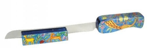Add a unique edge to your Shabbat table with this hand-painted challah knife that has oriental design on the handle. This challah knife comes with a stand to hold it.
