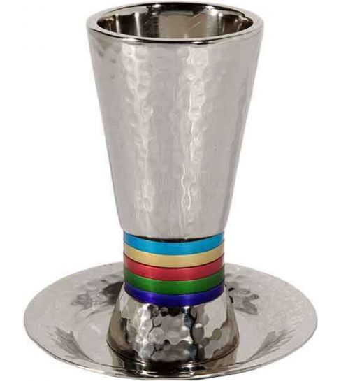 This well-crafted kiddush cup features a hammered texture and a unique cone shape with colorful multicolored rings on the bottom. Your Shabbat table will be complete with this beauty.