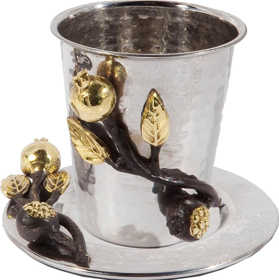 A traditional kiddush cup made unique by the sleek look of modern hammered silver paired with delicate golden pomegranate detail.
