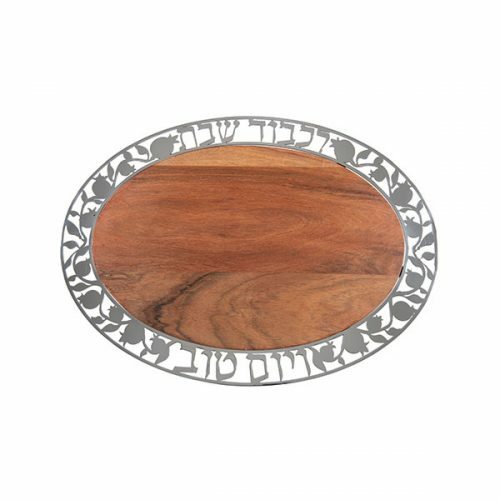 ๏ปฟThis oval challah board is madeย of acacia wood surrounded by a laser-cut stainless steel design of pomegranates. The words "In honor of Shabbat and Holidays" in Hebrew grace the top and bottom of this exquisite board.ย