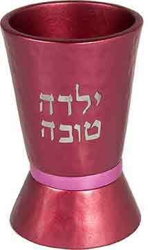 An adorable and unique baby gift for the newest little girl in your life. This is a kiddush cup made of hammered metal in a pink finish and a light pink ring on the bottom half of the cup. It's perfect for little hands and the bottom serves as sturdy stand.