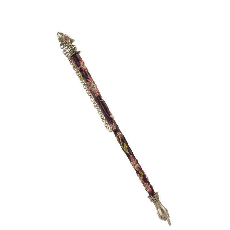 This pewter Yad pointer is used to read from the Torah on Shabbat and Holidays. The base of this beauty is hand-painted plum, against which pink flowers stand out gorgeously. Silver vines with green leaves decorate the piece as well with a small butterfly perched on top and Swarovski crystals dotting throughout. A chain is attached for hanging and a hand is pointing at the bottom to assist with pointing along as the Torah is read.