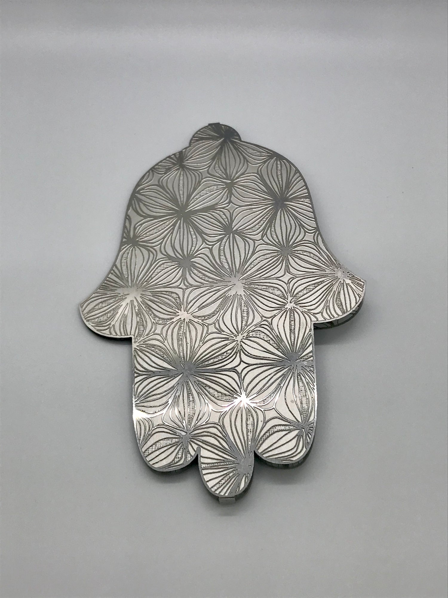 Talila Abraham combines the traditional process of hand-crafted lace with modern metal in this beautiful Chamsa. The Chamsa is an ancient symbol of protection and blessing, and this fashionable piece makes a great gift.