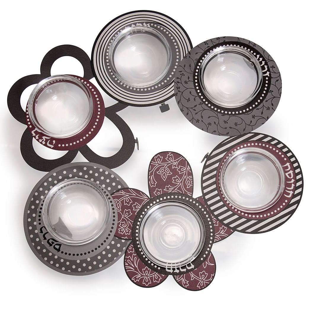 This distinctive Seder plate features a laser cut pattern in grey, burgundy and black that is sure to beautify your table. The Seder plate is made out of six rings that are combined into one Seder plate. There is a designated place for each of the special foods and their different names are displayed in Hebrew: Maror, Charosset, Matsah, Beitsah, Karpas, Zroa and Chazeret.