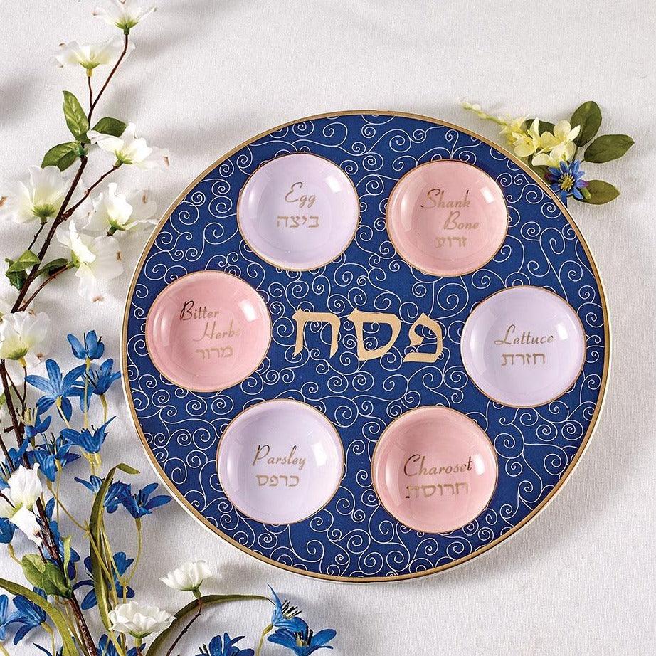 A seder plate that features each of the seder items written in minimalistic gold font and accented by the dark blue background. This piece brings together tradition and looks and is sure to elevate your seder night.