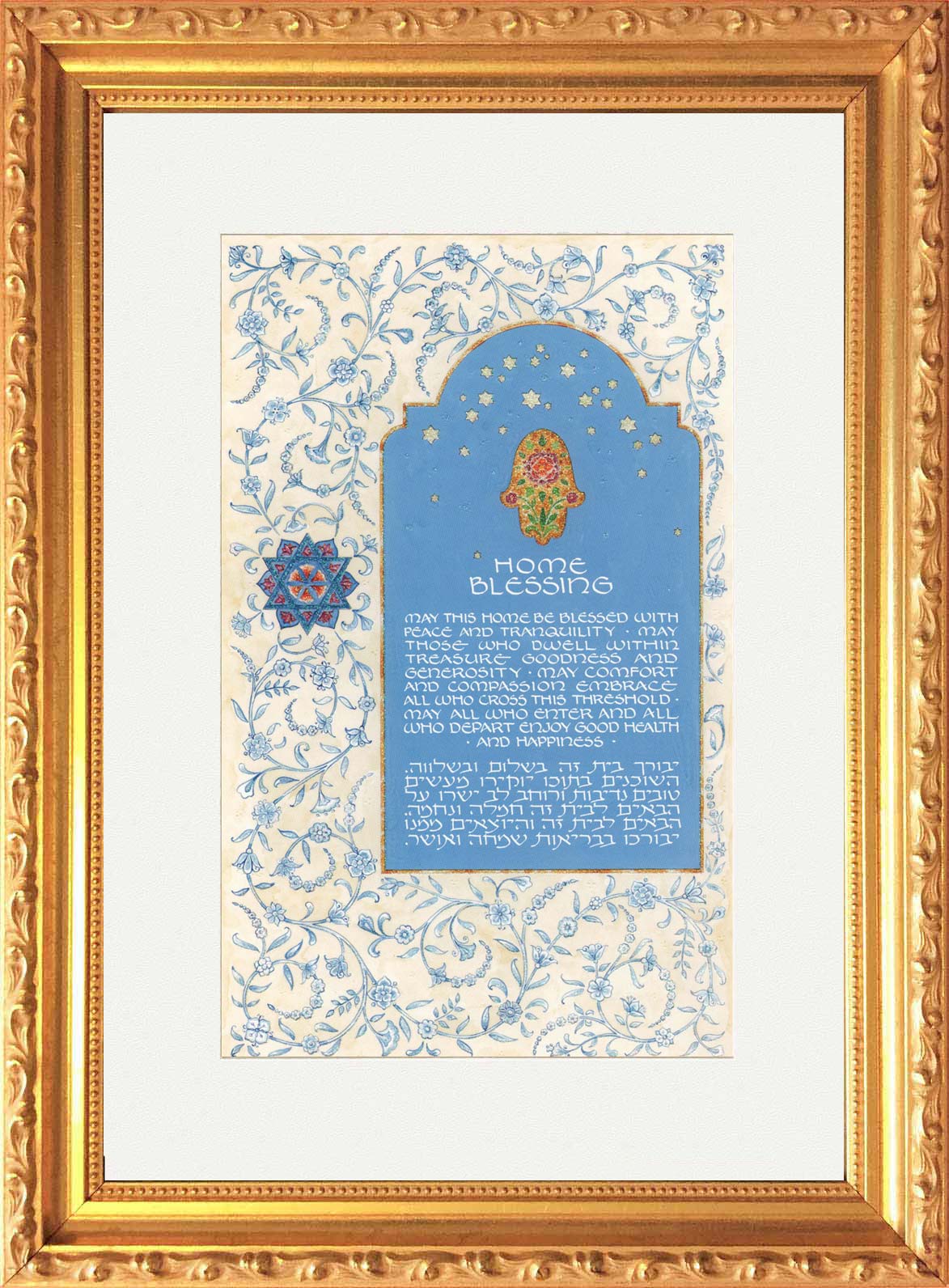 This striking print features a touching blessing for the home. The blessing is surrounded by an elaborate vine and flower design as well as elements like the Star of David and a traditional Hamsa for good luck.