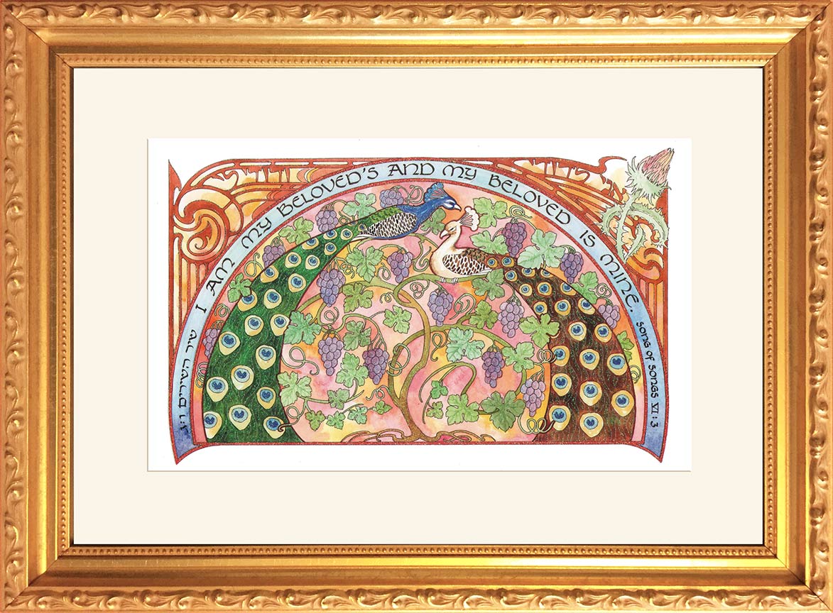 Say "I love you!" with this beautiful and intricate illustrated piece of Jewish art. Images of peacocks as well as exquisite crystal glitter adorn the verse, "I am my beloved's and my beloved is mine." This is an excellent wedding, engagement or anniversary present or for your significant other.