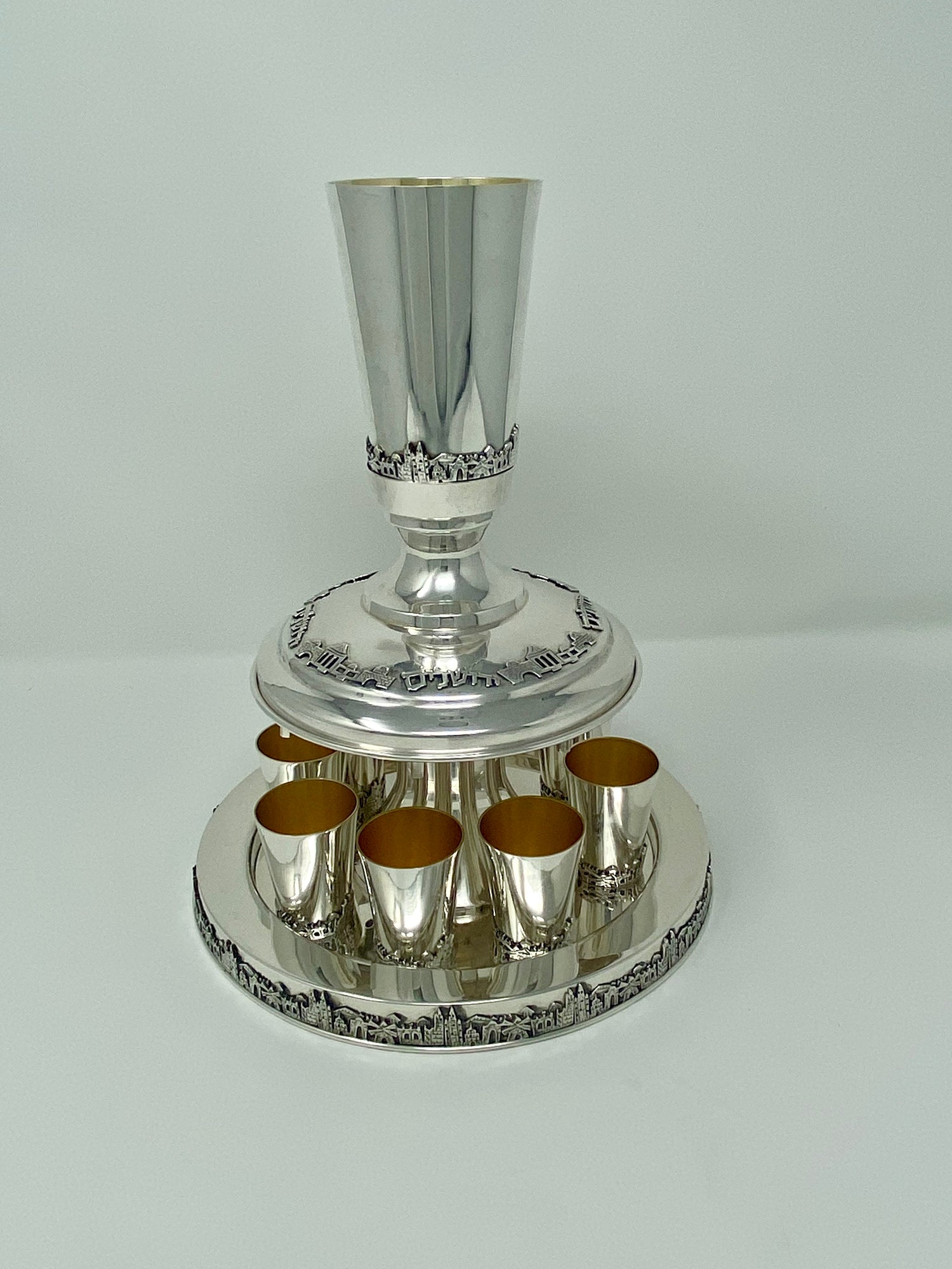 This sterling silver fountain was made in Israel using Yemenite traditional handwork. The Jerusalem skyline and Hebrew inscription sets it apart from other Kiddush dividers.