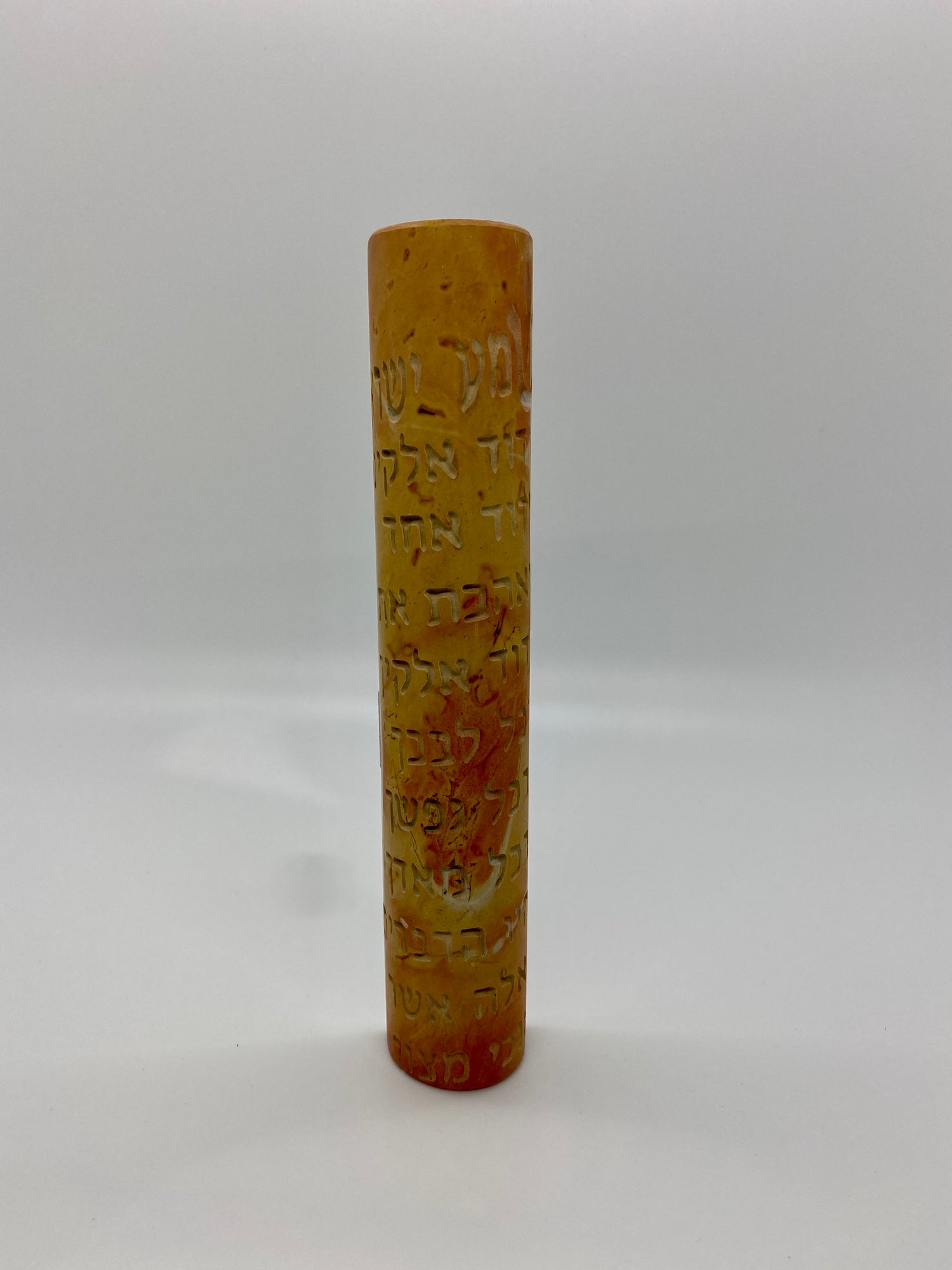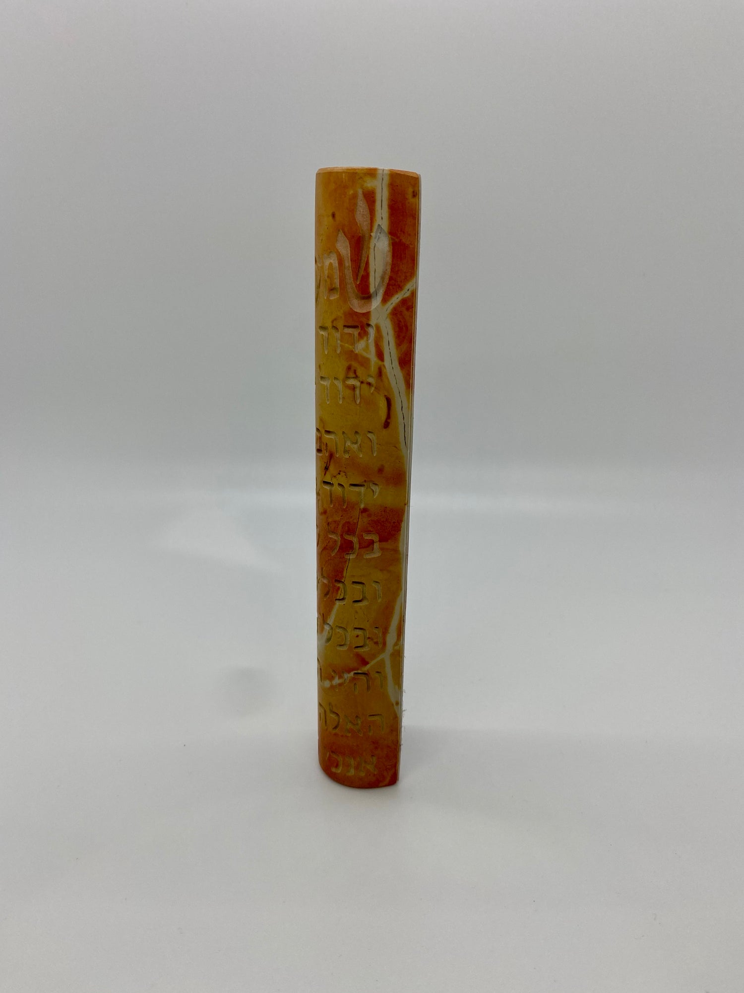 This Mezuzah made of real Jerusalem stone is imported from Israel and has the holy Shema prayer wrapped around its exterior. Designed for both indoor and outdoor use, it’s hung simply with a sticker, no nails needed. The Jerusalem stone insulates and protects the scroll inside.