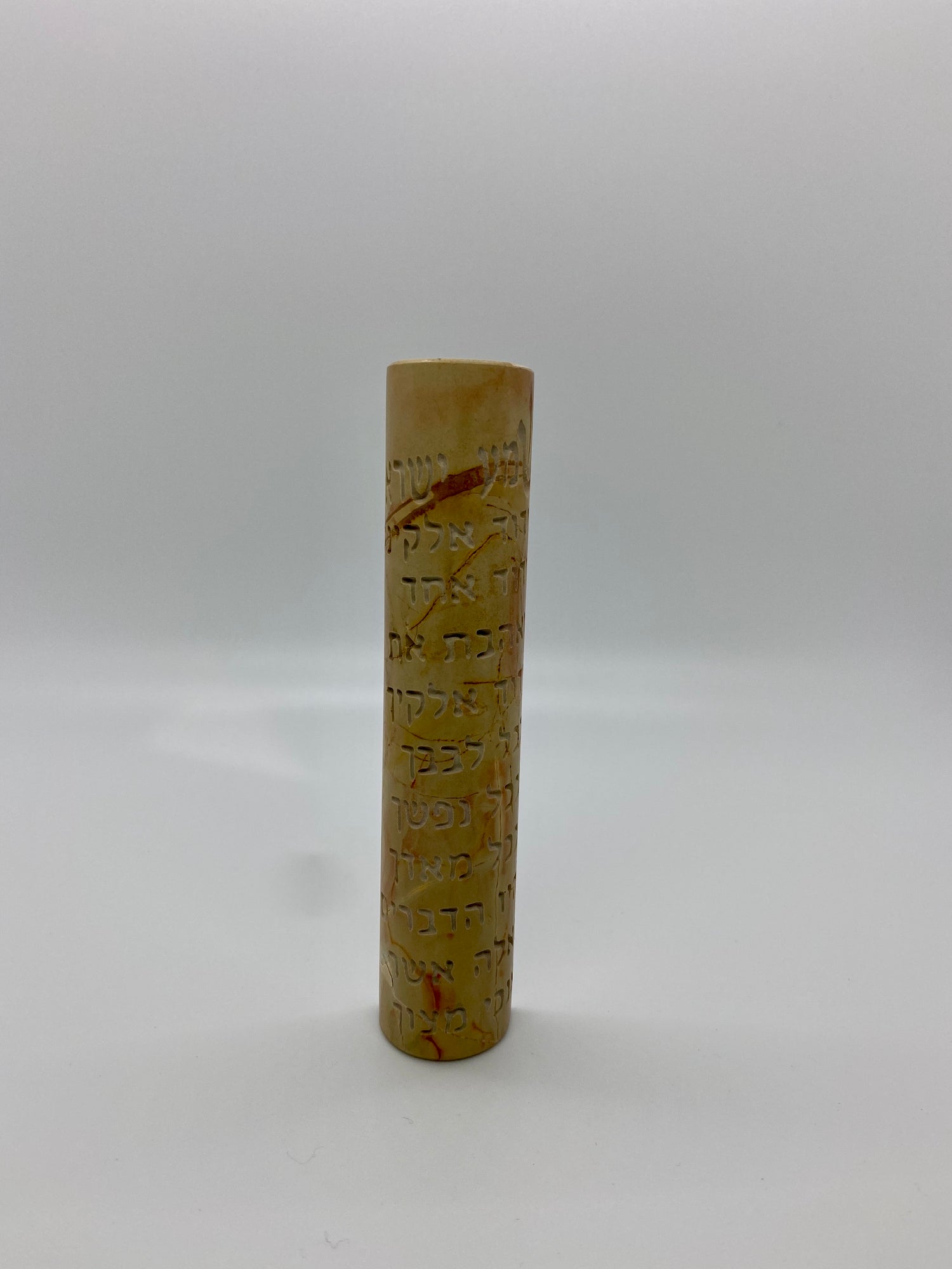 This Mezuzah made of real Jerusalem stone is imported from Israel and has the holy Shema prayer wrapped around its exterior. Designed for both indoor and outdoor use, it’s hung simply with a sticker, no nails needed. The Jerusalem stone insulates and protects the scroll inside.