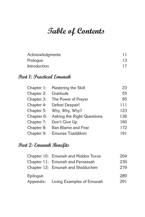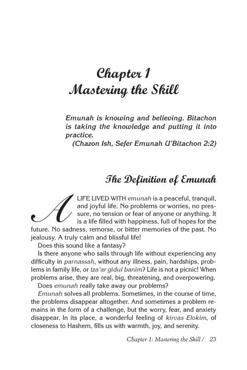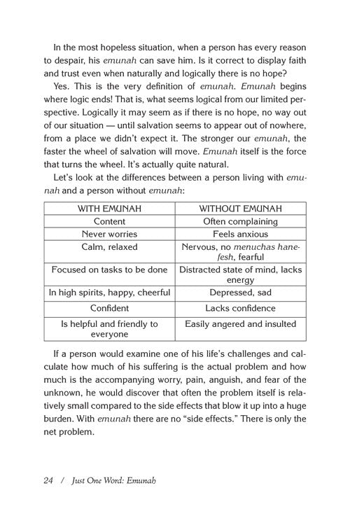 Just One Word: Emunah answers these questions and explains how to make emunah an integral part of our everyday lives. Emunah can give us the strength to deal with whatever Hashem has sent us with calmness and joy. This book will show you how.