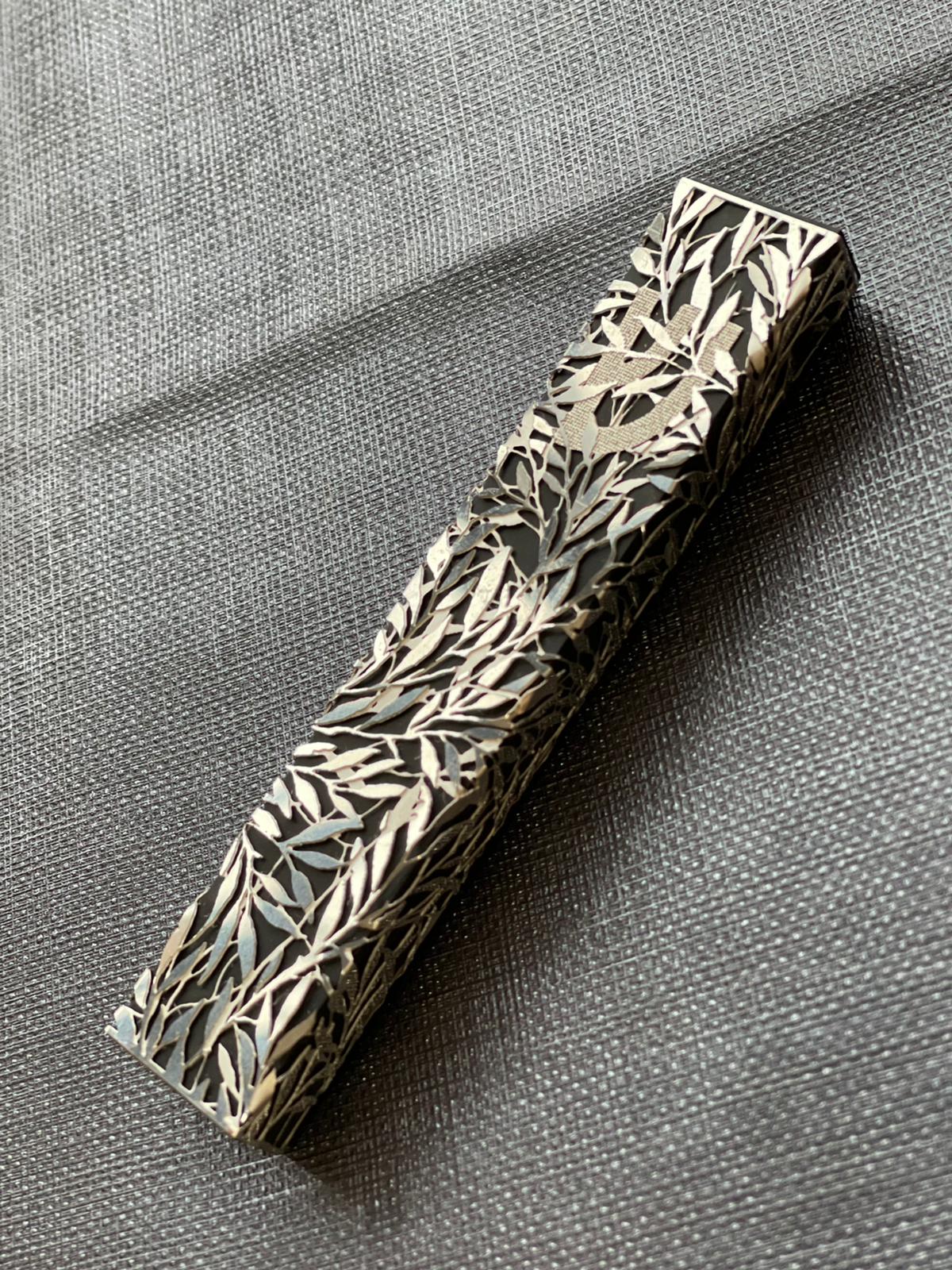 This leafy-vine Mezuzah case is handcrafted with the finest metals to stay beautiful over time and despite exposure. Designed and produced in Israel, it has the perfect mix of drama and modern style we’ve come to expect from Metalace.