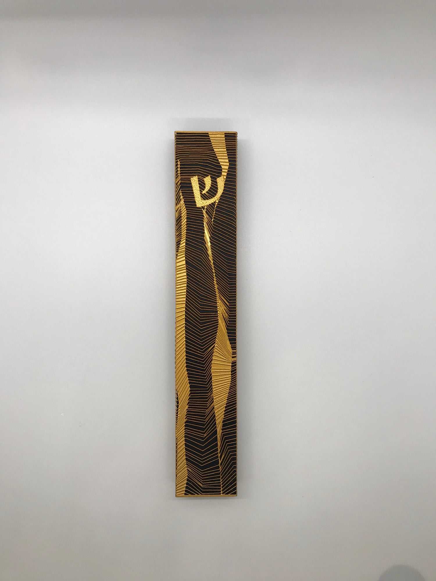 This stunning mezuzah’s bold design makes a statement on your doorpost. It had gold lines crossing over a black base in a modern and unique style. It is a stick on mezuzah, no nails needed. Can be hung indoors and outdoors.