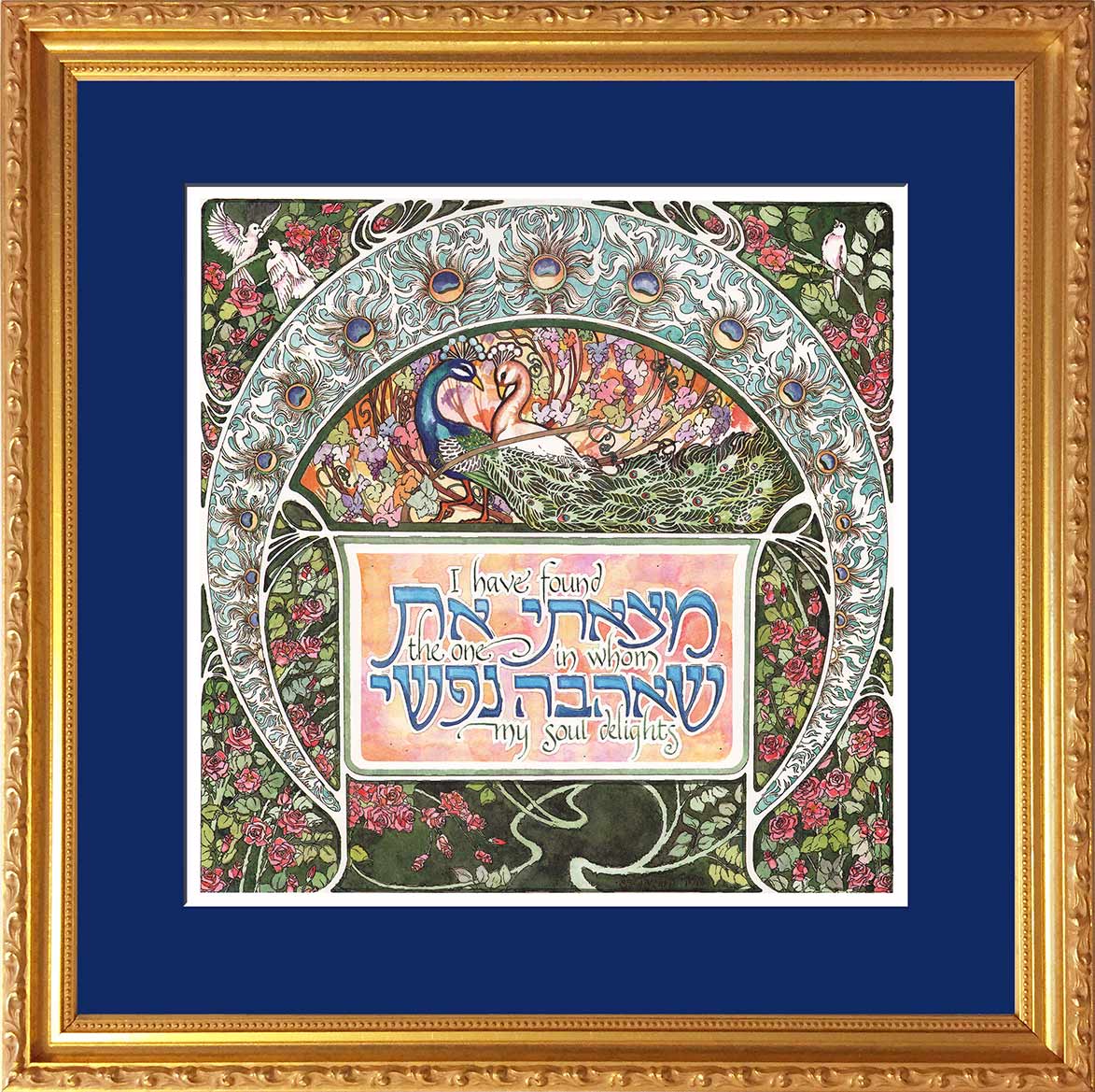 Say "I love you!" with this beautiful and intricate illustrated piece of Jewish art. Images of peacocks and doves and a lush vineyard and roses frame the verse, "I have found the one whom my soul loves." This is an excellent wedding, engagement or anniversary present or as a gift for your favorite person.