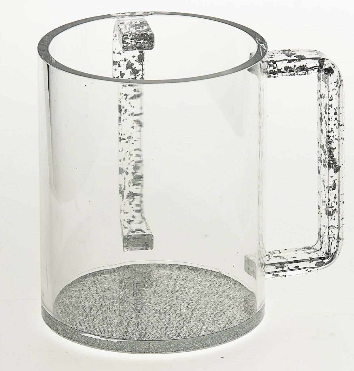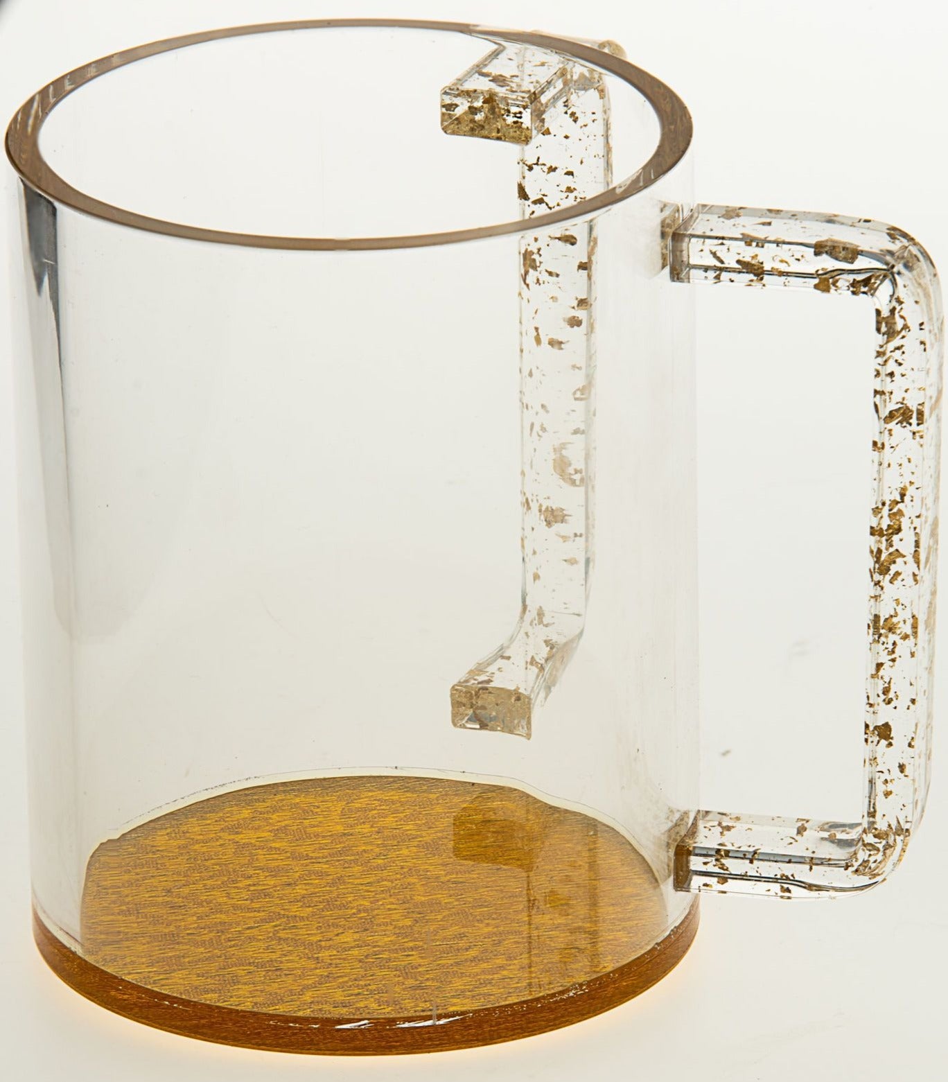 This is a modern Lucite wash cup with flecks of gold in the handles and an opaque gold bottom. Will complement any space!