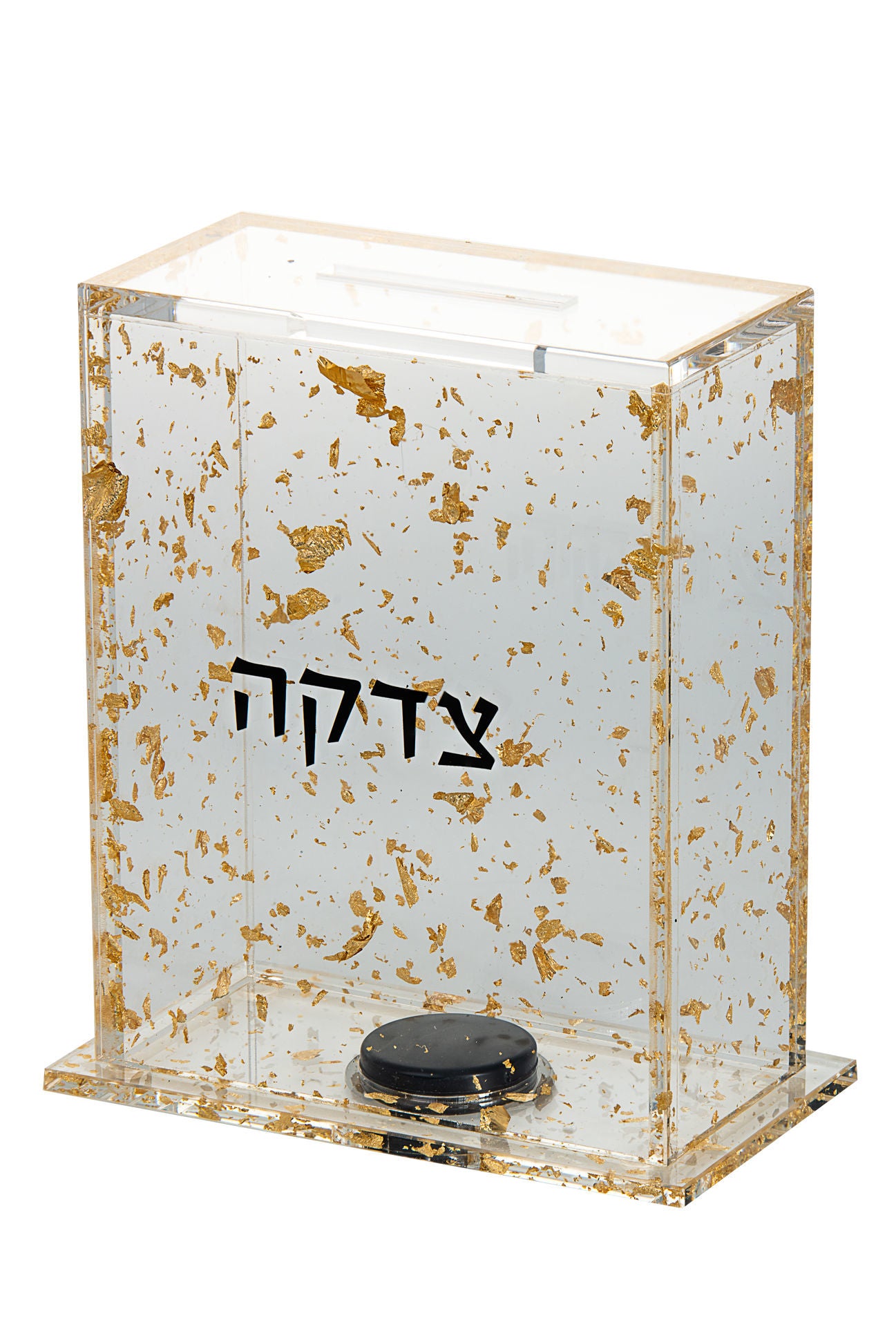The shimmering flakes embedded in this Lucite tzedakah box lend it an elegant yet fun look, who knew the two could coexist so harmoniously? Perfect for any space and every occassion.