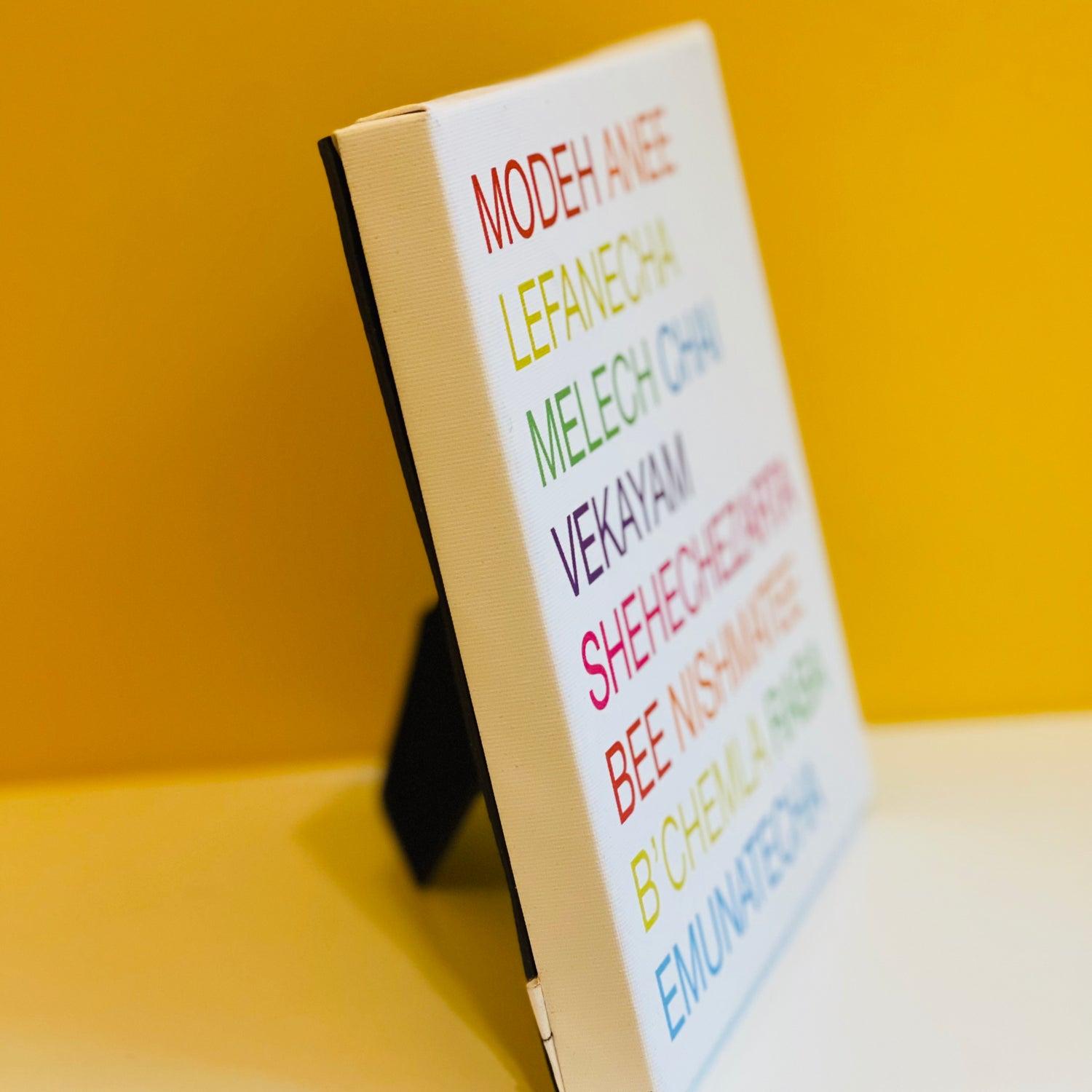 This artwork with a pop of color will definitely make a beautiful and fun statement in your home! Multicolored letters highlight the English transliteration of the Hebrew prayer of Modeh Ani which is recited upon awaking each morning and expresses gratitude to G-d for the miracle of life.