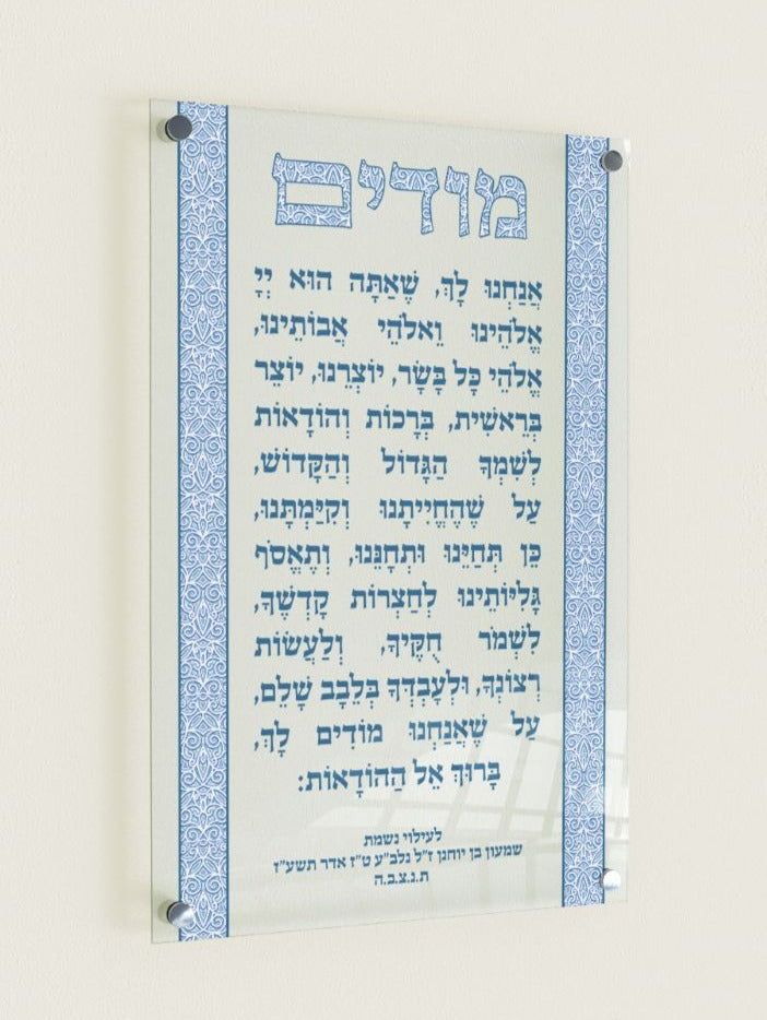 This modern-looking transparent Modim D' Rabanan Board is made of Lucite and features a lower plaque for dedication. Available in Ashkenazic and Sephardic text.