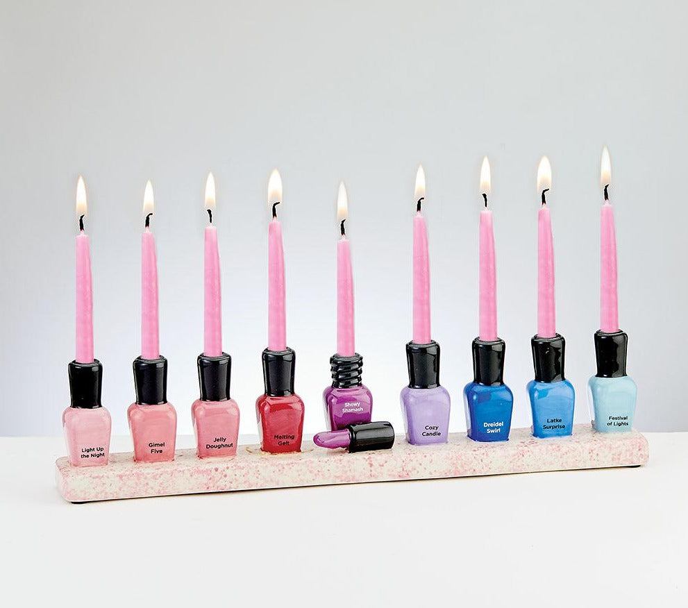 Your little girl has grown into a full-blown fashionista! Stun her with this chic nail polish menorah, with nine nail polish candle bases in varying dazzling colors.