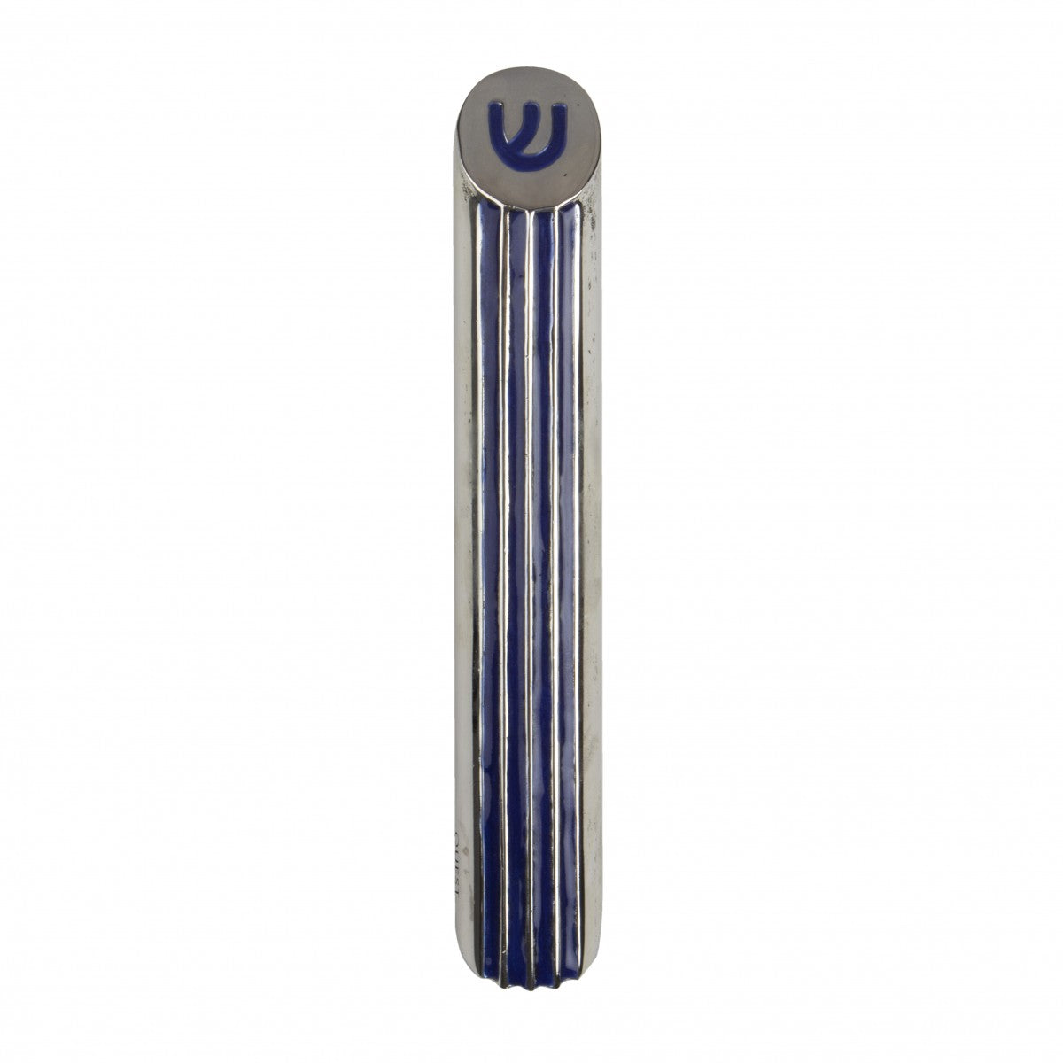 This stunning mezuzah case is handcrafted from pewter-plated silver. The design features vertical lines painted in a classy royal blue which matches the color of the “Shin” on top. This case will fit in perfectly in any home.