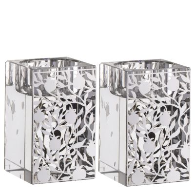 This dainty pair of tea-light candle holders will brighten your Shabbat! A detailed pomegranate design is featured on the outside of the holder and lends this piece a very elegant feel.