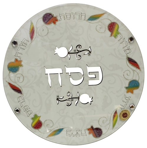 Set your Seder table apart from the rest with this good-enough-to-be-a-centerpiece Seder plate. It is made of wood and glass and lined with a border of various colored tulips and leaves it and has the names of the six foods of the Seder in Hebrew. The big highlight of this unique plate is its cutout center of the word Pesach and two pomegranates.