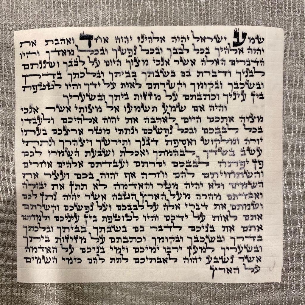A kosher mezuzah scroll is written by a professionally trained sofer (scribe) on parchment with a quill in beautiful calligraphic Hebrew letters. Each one is then scrupulously checked for accuracy.