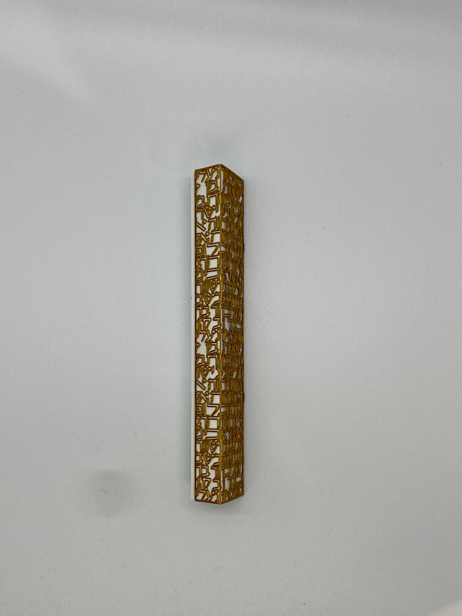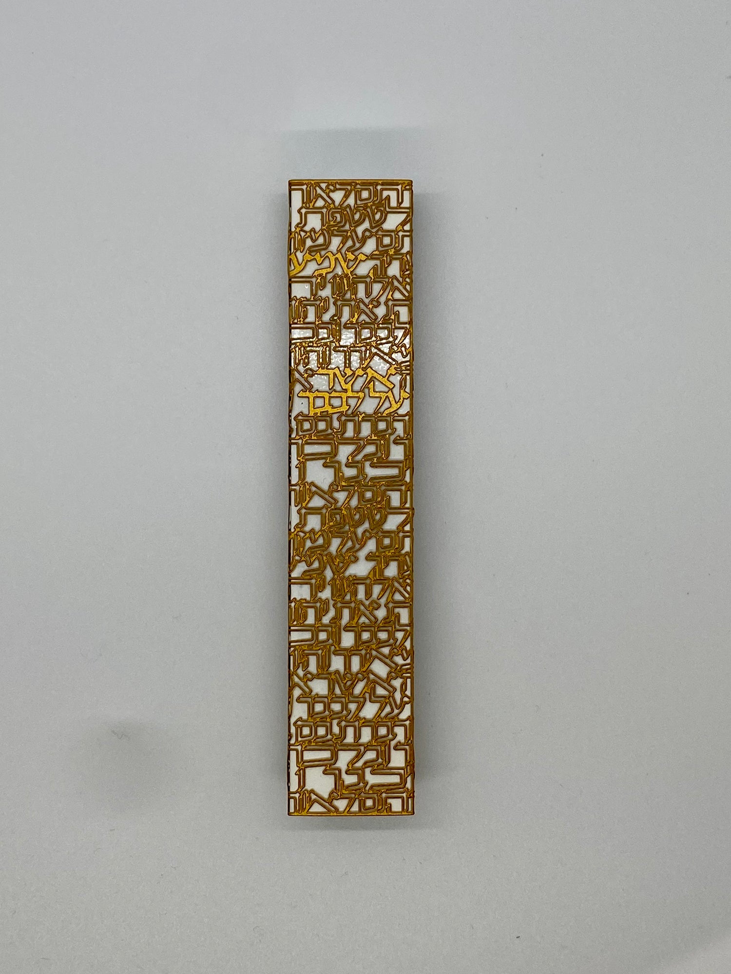 This sweet Mezuzah protects your home with the words of the beautiful Shema prayer wrapped in gold lettering over a white surface.