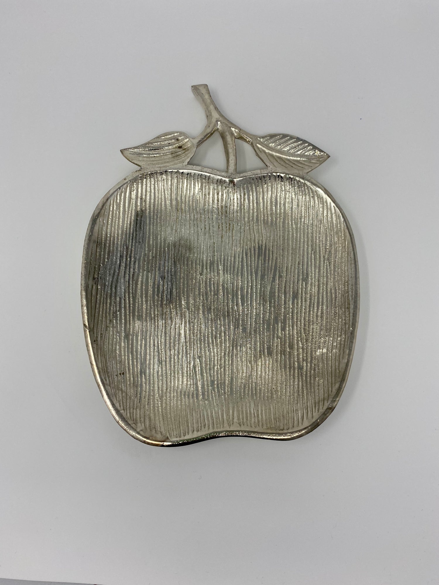 This silver dish is the shape of an apple, as is the removable silver honey jar that comes with it. Also included is a silver spoon with ridges. The tray is large enough to include other items alongside the honey jar.