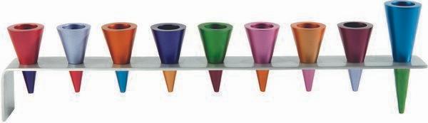 This gorgeous menorah will add a fun edge to your Chanukah experience. Upside down silver cones sit upon a silver colored metal strip which curves to form the stand.
