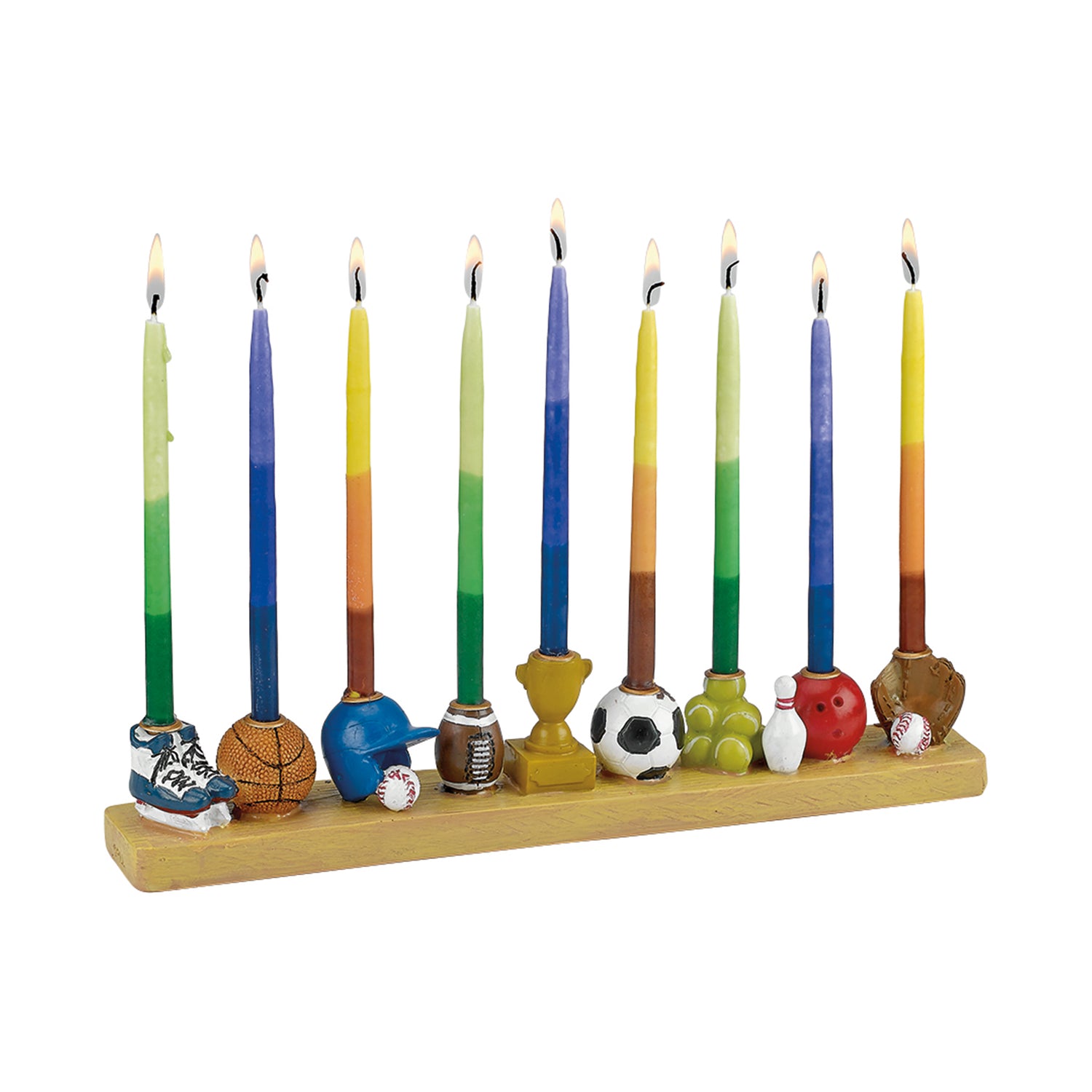 You'll definitely score a home run with this Menorah! With eight different sports miniatures as candle bases and a trophy shamash, this menorah is sure to bring a smile to your budding sports star.