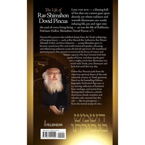 Based on the bestselling Hebrew biography Hashemesh Bigvuraso, this book is a collection of customs and stories from distinguished rabbis, Torah scholars, family members and students of Rabbi Pincus who ensured that this book—like its protagonist—bears the eternal stamp of truth.