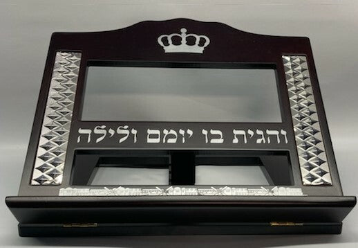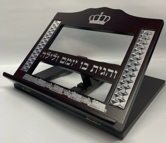 A supportive and beautiful tool to help you study Torah at home or in synagogue, this shtender is the perfect way to prop up your sefer of choice. This shtender is made of dark wood and features silver strips on the sides. The words "And you shall pore over it day and night" in Hebrew serve as a reminder of the preciousness of Torah study.